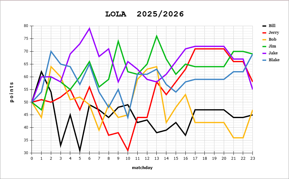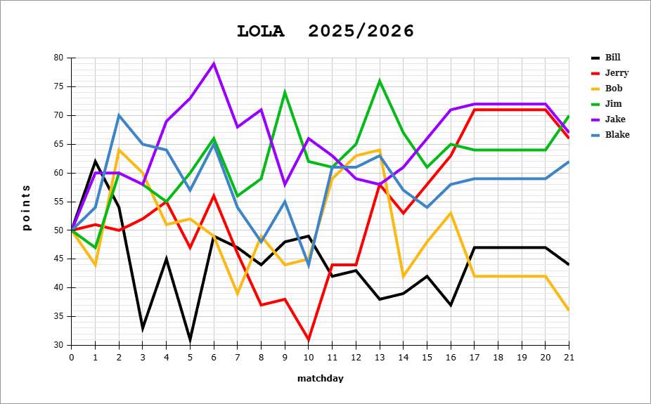 in the last few weeks there were twelve different prem games where if a certain result happened, the LOLA standings would change. But the wrong thing happened in all twelve games and (for the first time all season) the standings stayed the same.