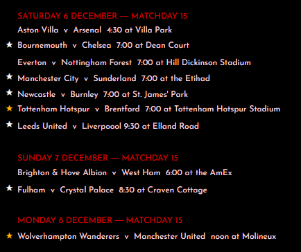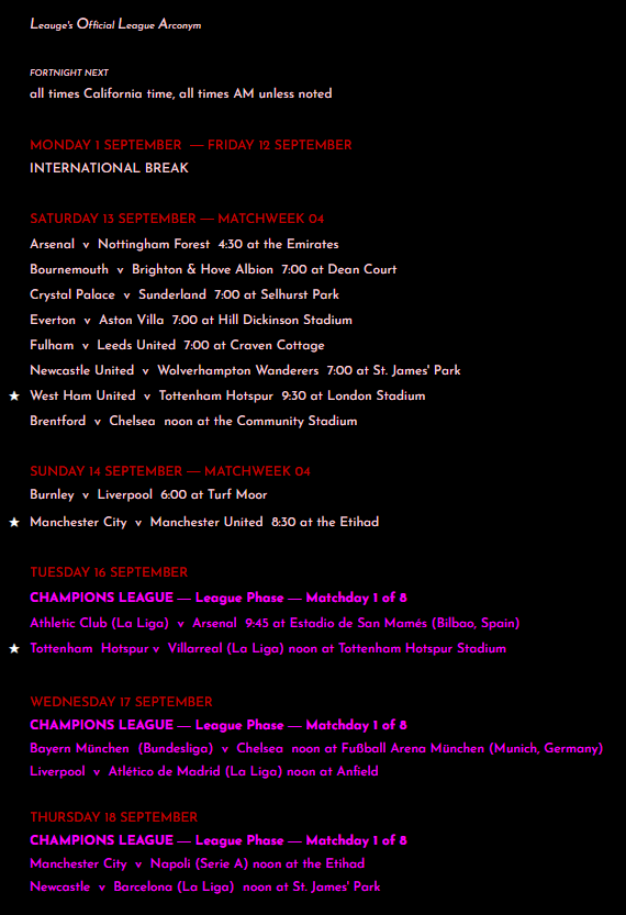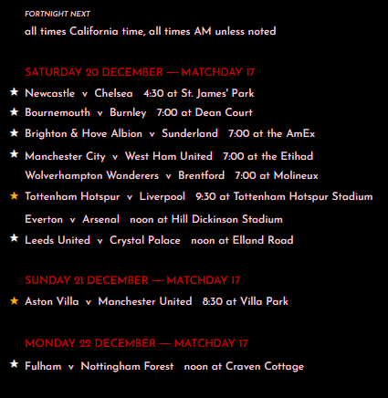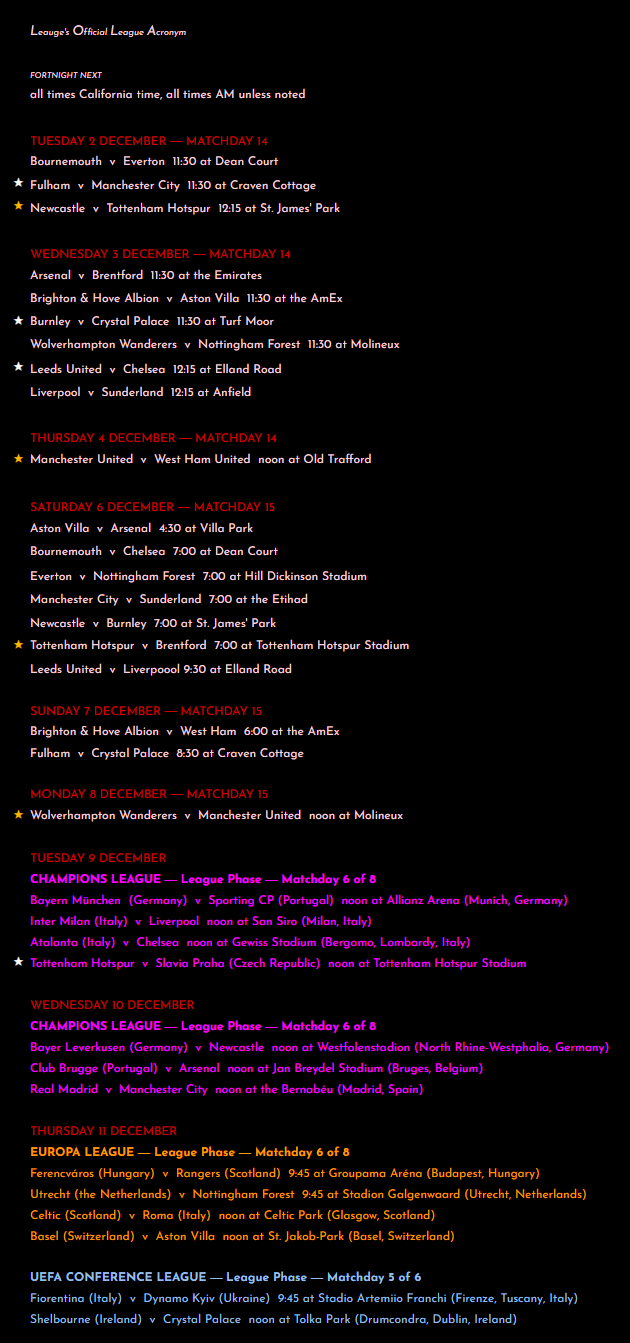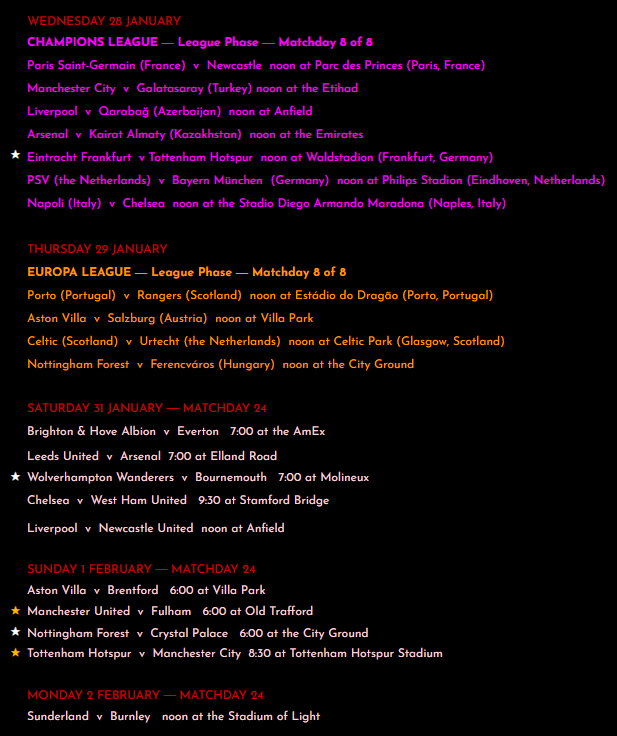 for Champions League, the schedule will always show the games involving the six (!) English teams (Liverpool, City, Newcastle, Spurs, others), plus the Harry Kane games