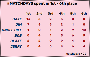 •The graph shows how our season progressed. Check out Matchday 35, it looks like something dramatic must have happened. What was it? No one remembers. If you remember, feel free to tell your story below in the Comments section