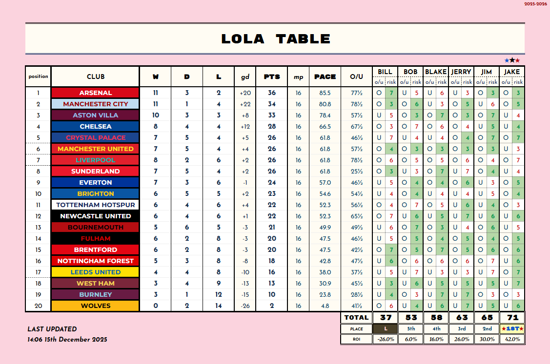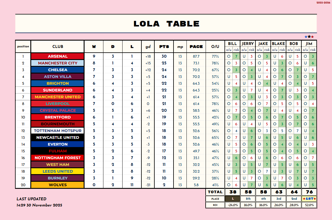 •pale stars for any game whose result could change the LOLA TABLE