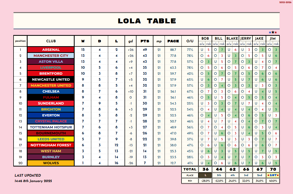 Looking ahead, only four of the twenty prem teams feel like their LOLA fate is already sealed (Villa, Sunderland, West Ham, and Wolves), and the other sixteen teams are still on the board. So it's going to be a wild ride from here, easily the most exciting competition or group activity any of us has ever been involved with